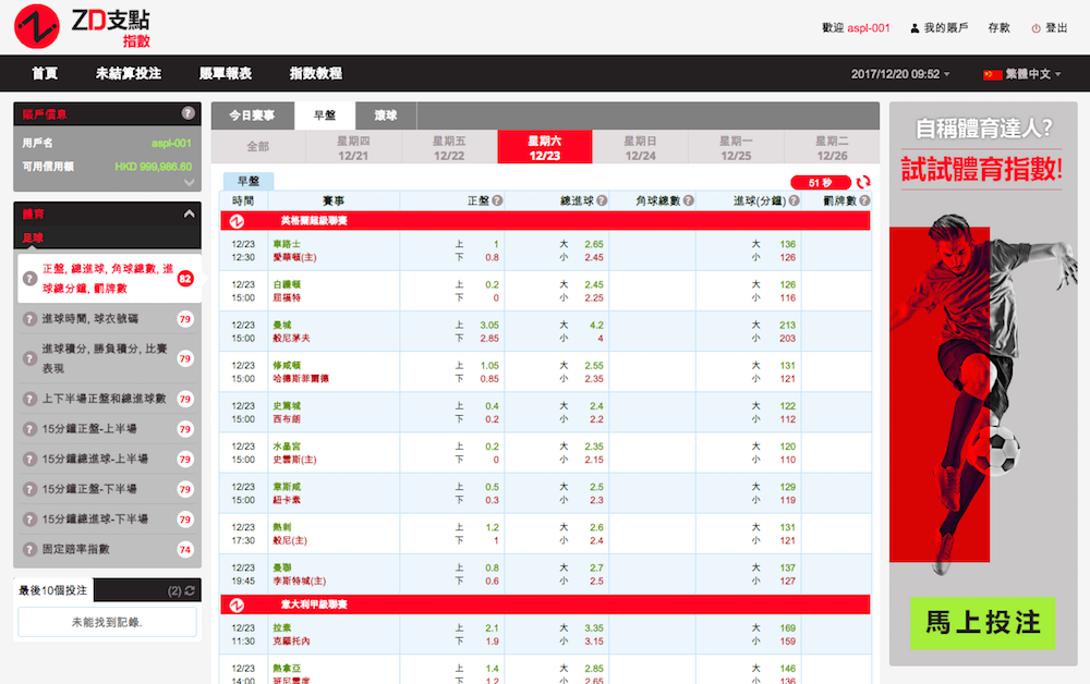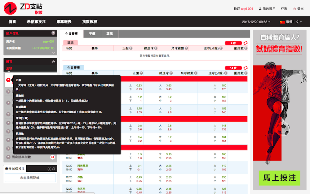 支點指數 (Zedee Spreads) 是體育足彩市場上的閃耀新星,給玩家提供一種全新的體驗。以融合金融市場上交易買賣價所帶來的刺激體驗和玩家對體育賽事的認知和熱情為宗旨,支點指數不但給玩家提供一種全新的的體育體驗,而且還讓玩家有翻倍盈利的機會。跟傳統的固定賠率玩法(即勝負平或大小盤)比較,體育指數可以讓您對賽事的預測實現更有價值的轉換。您可以通過體育指數上更多種類的玩法,如正盤、入球總數/總得分、角球正盤和犯規牌數積分等為您帶來更豐厚的潛在收益。