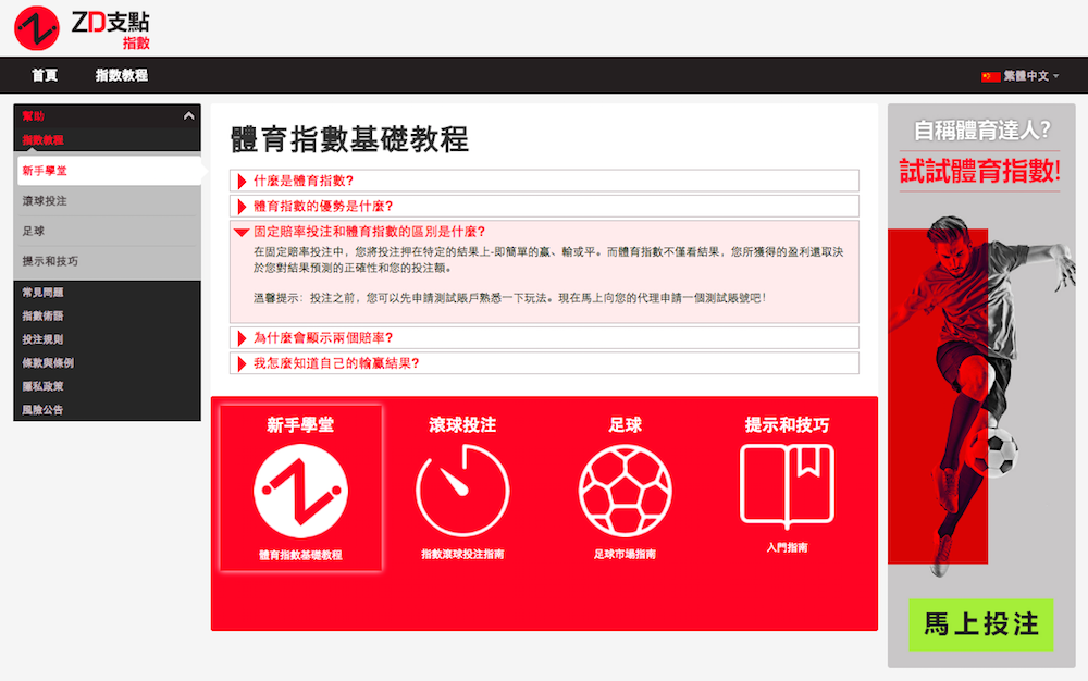 持黑山牌照的支點指數 (Zedee Spreads)於2017年帶著全新的體育玩法和現代精美的設計界面上線。經我們博籮試用,支點指數電腦版及手機版操作界面流暢,全天候接受涵蓋早盤和滾球市場等的投注。結算快,資金流動靈活性高。他們除了在足球市場開拓跟傳統與眾不同的玩法,讓新玩家和專業玩家都能盡興而歸,還準備在不久將來推出籃球、美式足球、高爾夫球、網球和板球等適合各階層各地域玩家的市場。如果您擔心自己是體育指數的新手?沒關係,支點指數網站上提供詳盡的指數教程,並在您投注的同時手把手跟您解釋每個市場的玩法及計算方式。所以,支點指數絕對是體育市場上不能錯過的新一代玩法!