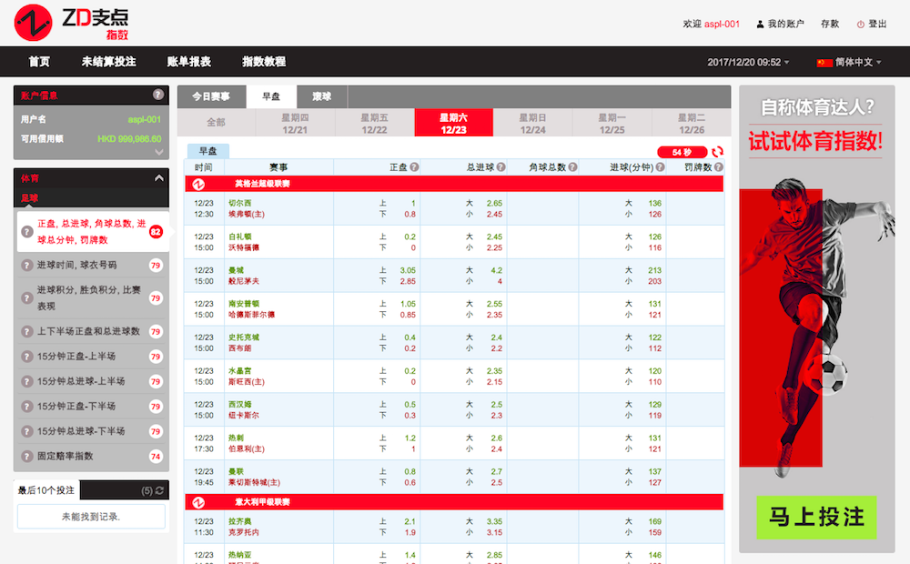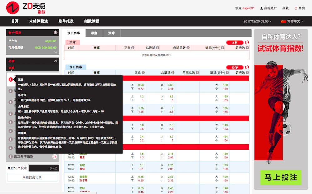 指数中最受欢迎的市场是正盘和总进球数。而支点指数突破既有思维,还为玩家引进了上下半场和15分钟间隔的正盘和总进球数市场,让玩家在一场比赛的分分秒秒都可以享受体育和指数的乐趣。