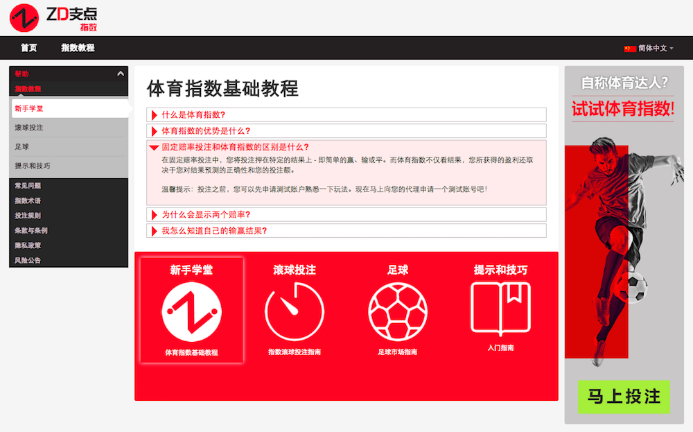 持黑山牌照的支点指数 (Zedee Spreads)于2017年带着全新的体育玩法和现代精美的设计界面上线。经我们博箩试用,支点指数电脑版及手机版操作界面流畅,全天候接受涵盖早盘和滚球市场等的投注。结算快,资金流动灵活性高。他们除了在足球市场开拓跟传统与众不同的玩法,让新玩家和专业玩家都能尽兴而归,还准备在不久将来推出篮球、美式足球、高尔夫球、网球和板球等适合各阶层各地域玩家的市场。如果您担心自己是体育指数的新手?没关系,支点指数网站上提供详尽的指数教程,并在您投注的同时手把手跟您解释每个市场的玩法及计算方式。所以,支点指数绝对是体育市场上不能错过的新一代玩法!