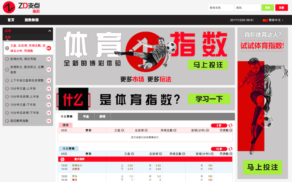 支点指数 (Zedee Spreads) 是体育足彩市场上的闪耀新星,给玩家提供一种全新的体验。以融合金融市场上交易买卖价所带来的刺激体验和玩家对体育赛事的认知和热情为宗旨,支点指数不但给玩家提供一种全新的的体育体验,而且还让玩家有翻倍盈利的机会。跟传统的固定赔率玩法(即胜负平或大小盘)比较,体育指数可以让您对赛事的预测实现更有价值的转换。您可以通过体育指数上更多种类的玩法,如正盘、入球总数/总得分、角球正盘和犯规牌数积分等为您带来更丰厚的潜在收益。