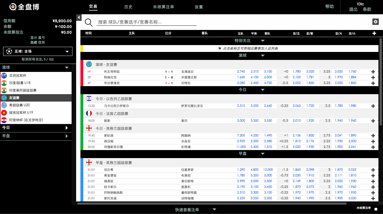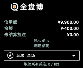 全盘博上显示的报价会一直根据博彩公司的数据进行实时更新。所以, 您的投注和赔率都会是在实时的基础上被确认。