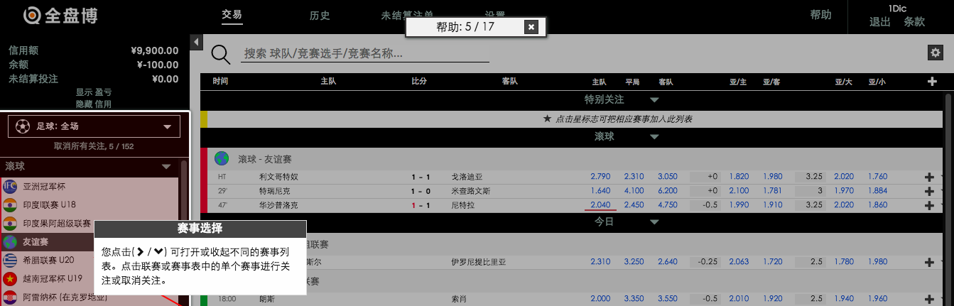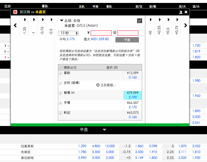 假如您的投注额比您所选择的最好赔率所提供的可投注额更高,系统会自动跟进到下一个最好的赔率并完成投注。这样就会提供给您平均的赔率,而您也不用浪费时间去登录多个账号去投注。这个功能在早盘、滚球盘中都可用。